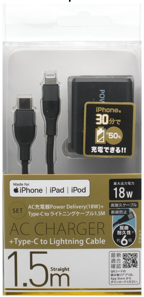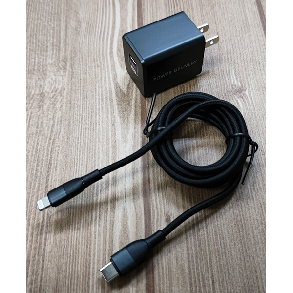 本製品はPowerDelivery(PD)に対応したAC充電器と高耐久、屈折耐久のType-C⇔Lightningケーブルのセット商品です。