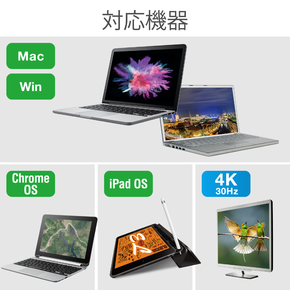 一台二役の便利な変換アダプタ。USB Type-C端子を搭載した機器の映像信号を変換し、VGA(D-sub15pin)とHDMIへ映像出力ができるUSB Type-C用VGA・HDMI映像変換アダプタ。複製モードと拡張モードに対応します。(VGAポートとHDMIポートの同時接続時、VGA画面とHDMI画面には共通の画面を表示できます。)