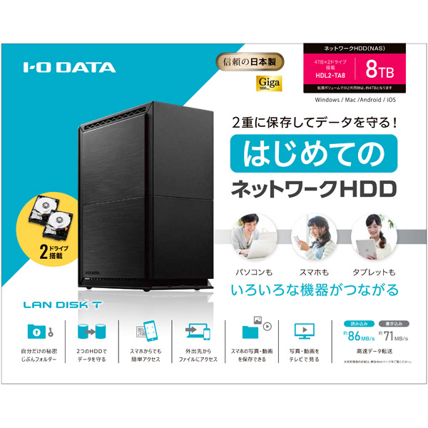 HDL2-TAシリーズは、はじめてでもカンタンに使えるNAS(ネットワークHDD)です。保存した写真や動画は、家族みんながスマホ・PCを使って自宅の中はもちろん、外出先からでも楽しめます。2つのHDDでデータを2重に保存するから、大切な思い出をしっかりと残しておきたい方におすすめです。