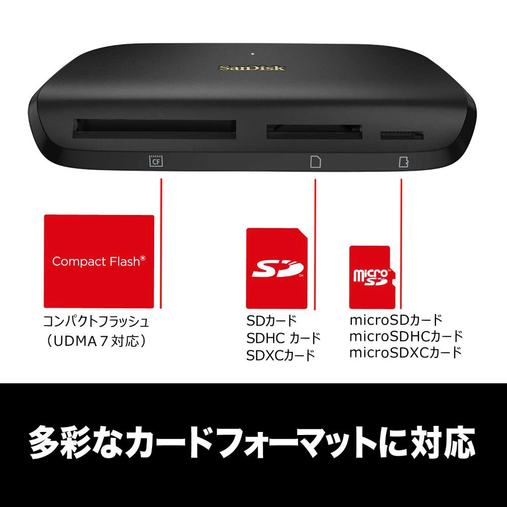■サンディスク イメージメイト プロ USB-Cマルチカード リーダー/ライター は、SDおよびmicroSDカード(UHS-II、UHS-I、非UHS)、コンパクトフラッシュカード(最大UDMA 7)に対応します。
