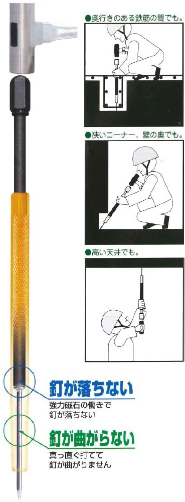 先端がマグネット式ですので,特に狭いところに釘を打つ場合,金槌が振れないときにも,上向き,下向き,斜め打ちをしても確実に打てます。