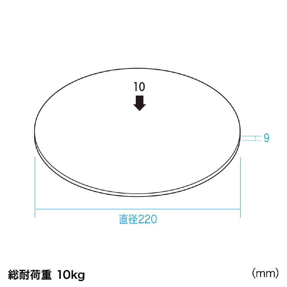 | 仕様1 | サイズ:W220×D220×H9mm 重量:約490g 出荷形態:組立出荷 材質:アルミニウム・PA(ポリアミド) 総耐荷重:10kg 付属品:滑り止めゴム(4個) |