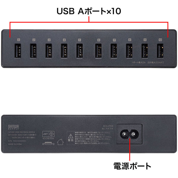 AC - USB充電器 タブレット・スマホ対応 20A [10ポート:USB-A] ACA-IP68