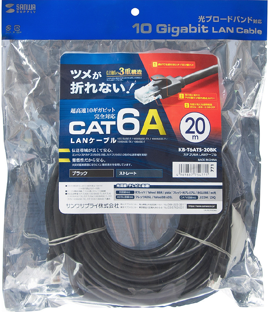 KB-T6ATS-20BK LANケーブル  ブラック [20m /カテゴリー6A /スタンダード]