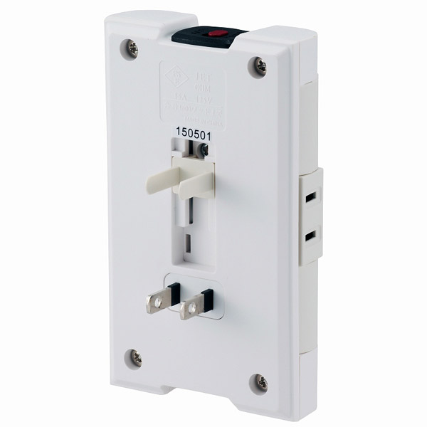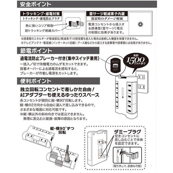 雷サージ軽減素子内蔵で落雷時のダメージを軽減する90°回転する壁コンセント用タップです