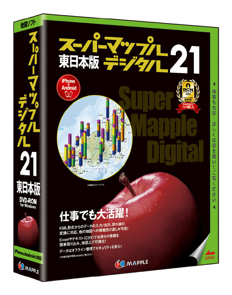 「iOS/Android」にも対応した多機能型電子地図ソフトの東日本版。パソコンで日常のお出かけ情報の収集、編集からビジネス活動まで支援。