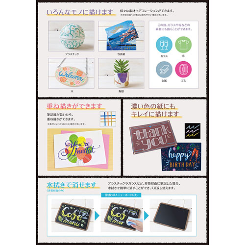 プラスチック、写真紙、木、陶器など様々な素材へデコレーションができます。筆記線が乾いたら、重ね描きができます。プラスチックやガラスなど非吸収面に筆記した場合、水拭きで簡単に消すことができ、くり返し使えます。