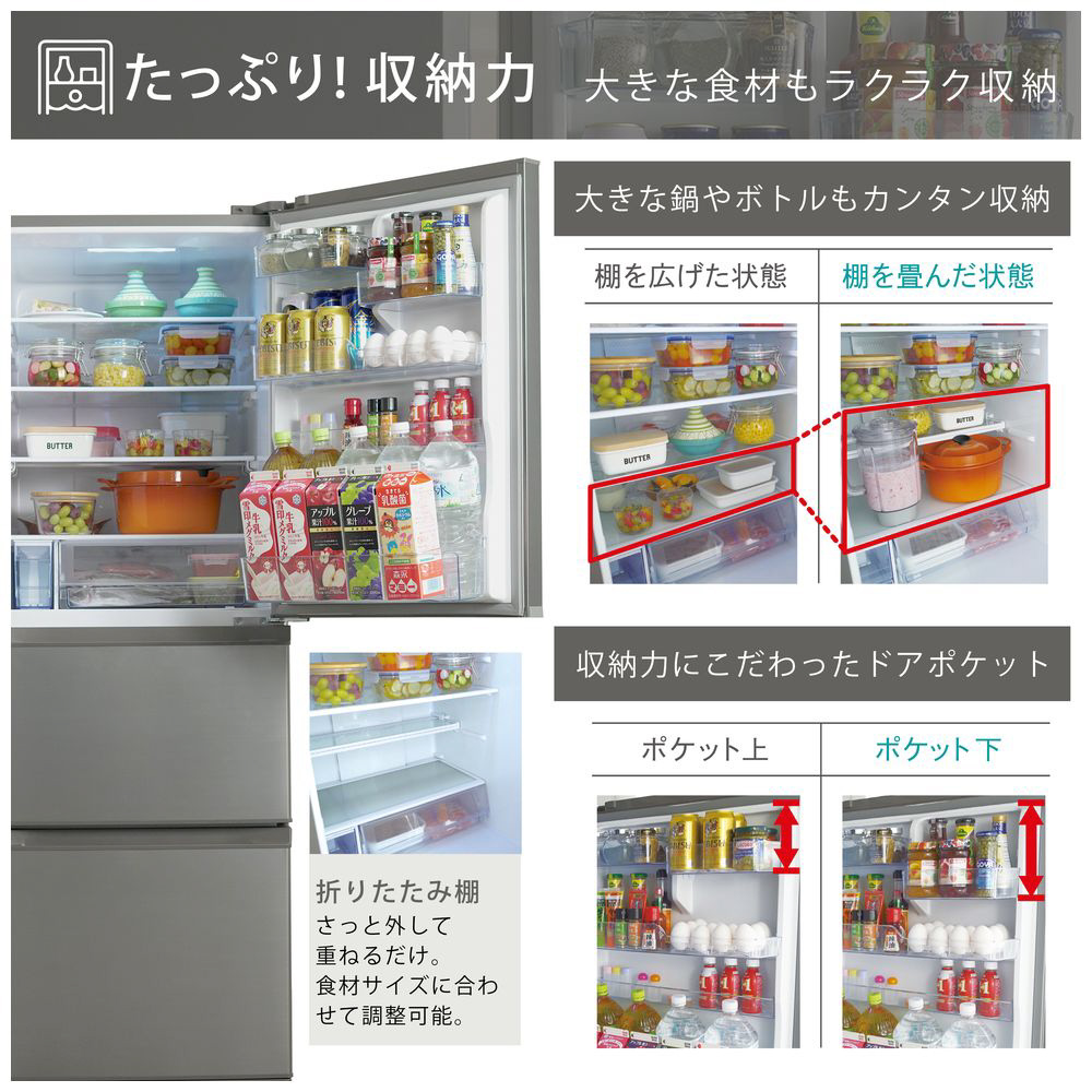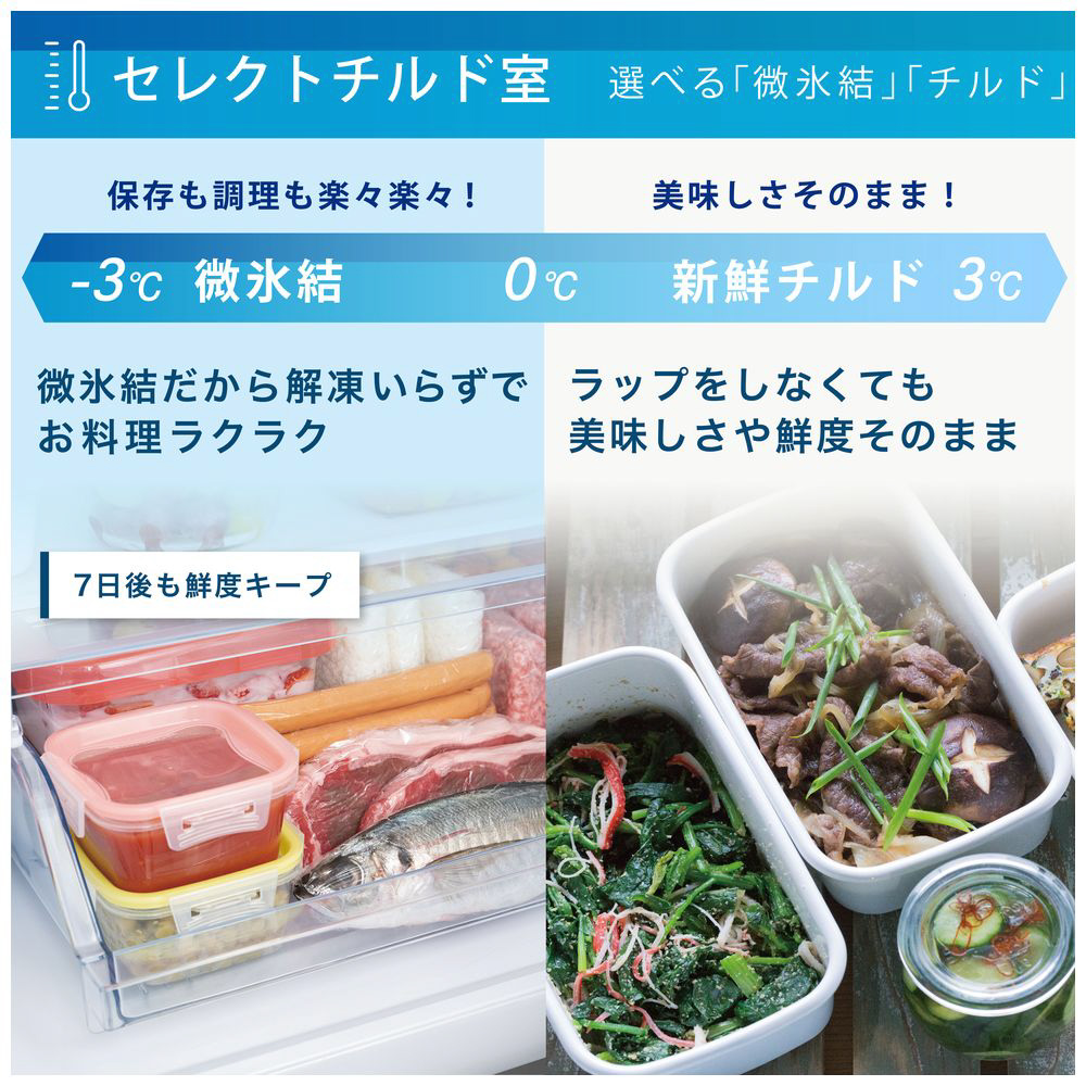 2〜3人暮らしにおすすめの360L 3ドア冷蔵庫。自動製氷システム&食材に合わせた保存方法を選べるセレクトチルド室搭載で、美味しさと便利さを実現した約20dB静音設計。