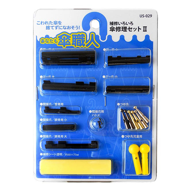 ●セット内容:三ツ爪小黒2本、三ツ爪大黒2本、四ツ爪小黒2本、四ツ爪大黒2本、間接爪 小親骨用黒1本、間接爪大親骨用黒1本、間接爪受骨用黒1本、ハトメ黒3本、つゆ先剣先型シルバー2本、つゆ先剣先型ブロンズ2本、つゆ先剣先型ゴールド2本、つゆ先児童用蓄光型黄色2本、補修シート透明約60x77mm1枚