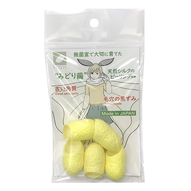 無菌室で育てられた清潔なみどり繭でお顔をマッサージすることにより、極細の繊維が毛穴の奥の汚れや古い角質をからめとり、シルクのようななめらかでキメの整ったお肌へ導きます。お顔以外にも、角質の気になるひじ、膝、かかと等にもご使用いただけます。