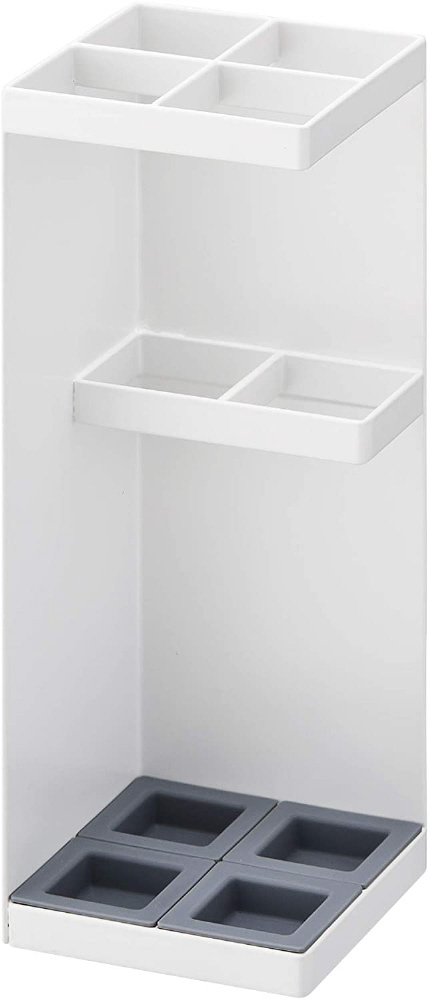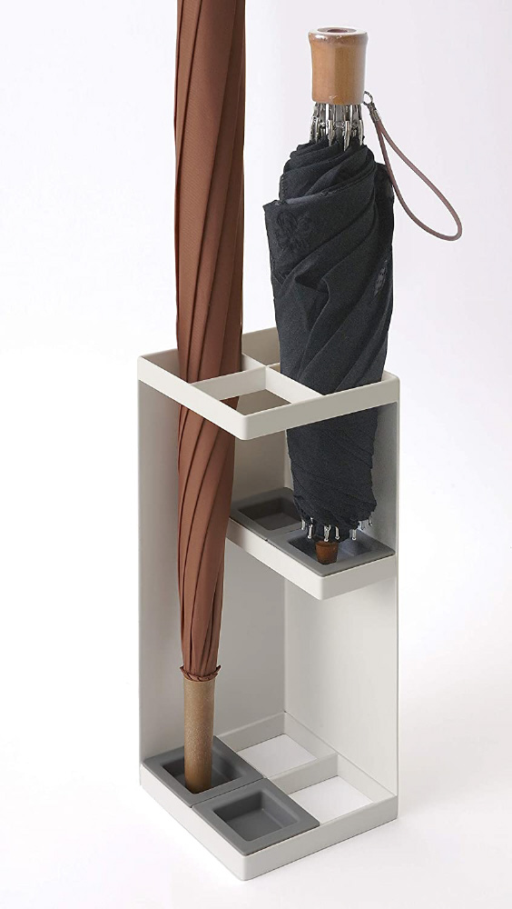 玄関の角にぴったりと収まるコンパクト角型かさたて。玄関で場所をとらない省スペースデザイン設計。トレイの位置を変えれば折り畳み傘を収納可能。傘収納可能数 4本。