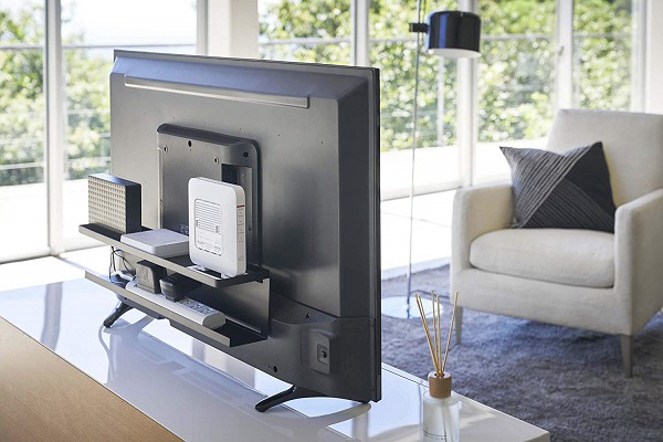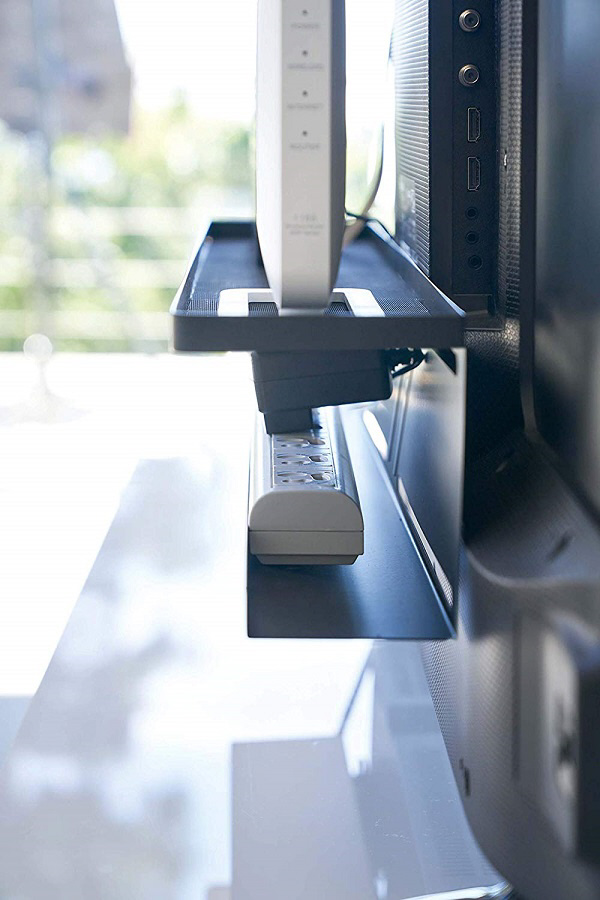テレビ裏スペースを有効活用。ルーターや外付けHDD、電源タップなどをすっきり一括収納。下段には電源タップを置くことができるので配線もすっきりとまとめる事ができます。VESA規格対応。テレビ裏のネジ穴にねじ込んで固定するだけなので簡単に設置できます。テレビ裏で隠して収納できるのでテレビ周りをすっきりと整理整頓する事ができます