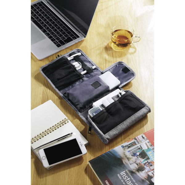 テレワークにも最適。タブレットやケーブルなどの周辺機器・ガジェット、筆記用具等ビジネス用品までまとめて収納することが可能なウォレット型ポーチです。