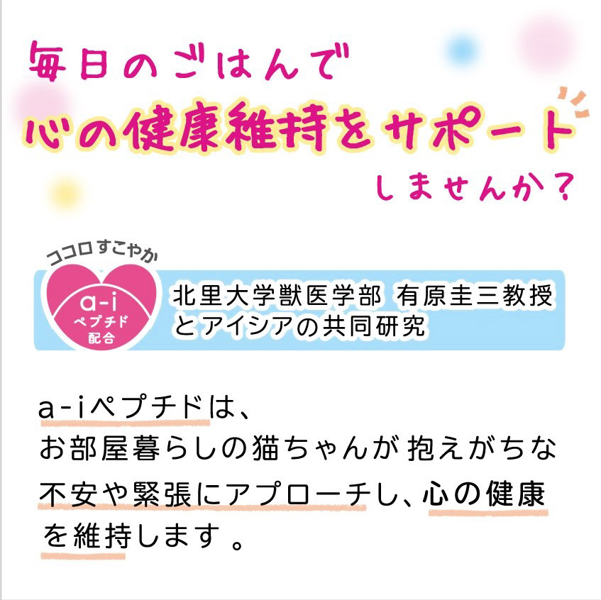 お魚とお肉のおいしさが詰まった素材を濃厚なグレービーソースでからめた総合栄養食。お部屋で暮らす愛猫の心の健康維持に配慮して「a-iペプチド」を配合。