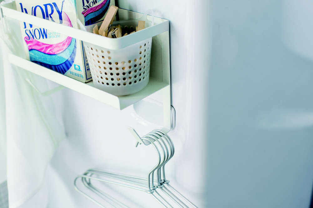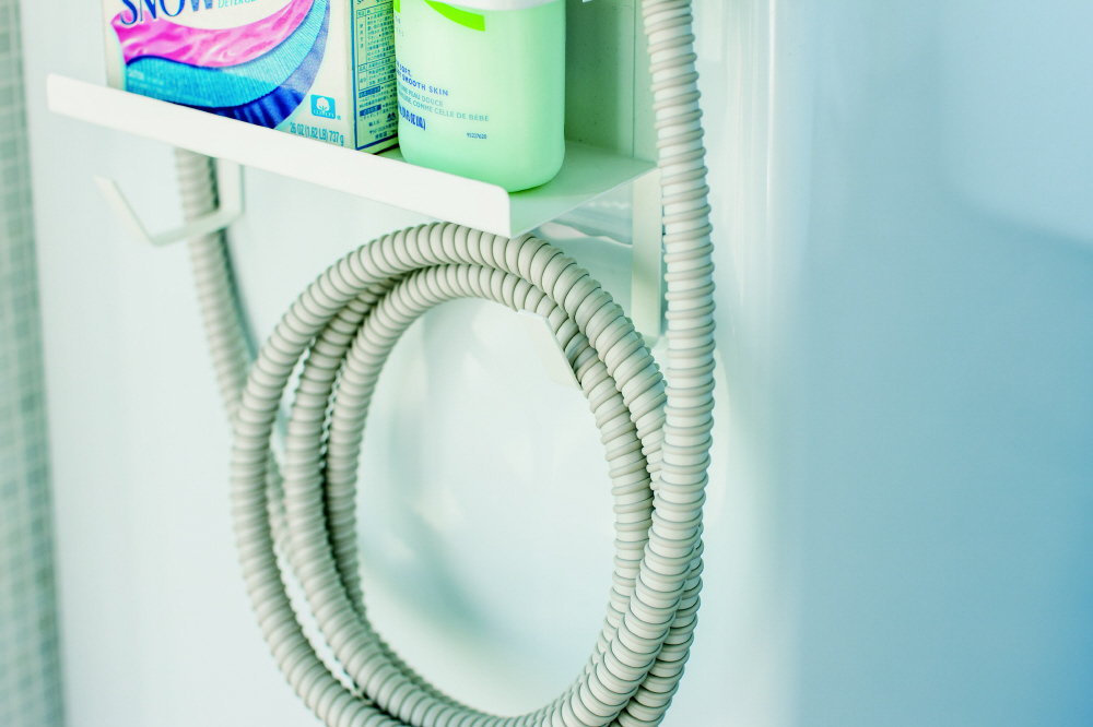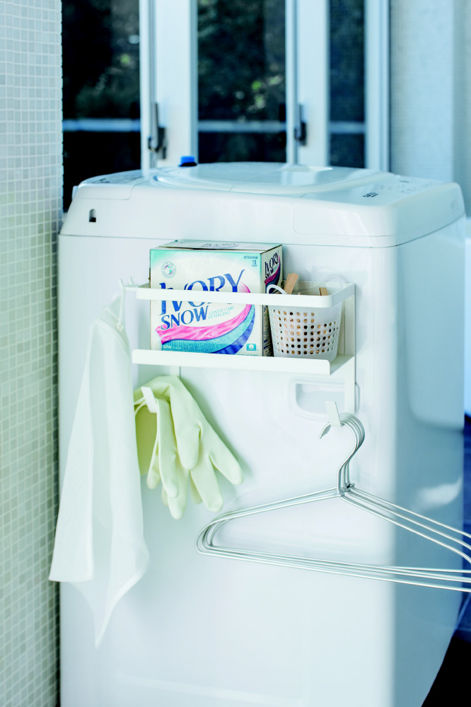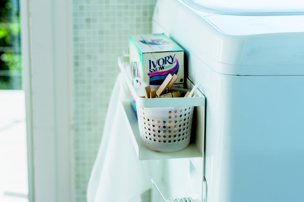 強力マグネットで洗濯機の側面に簡単取り付け。置き場所に困る給水ホースや洗濯用洗剤・小物などを洗濯機の側面に一括収納!
