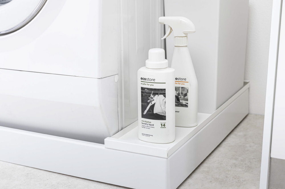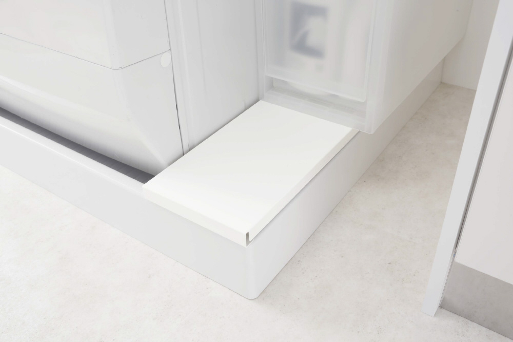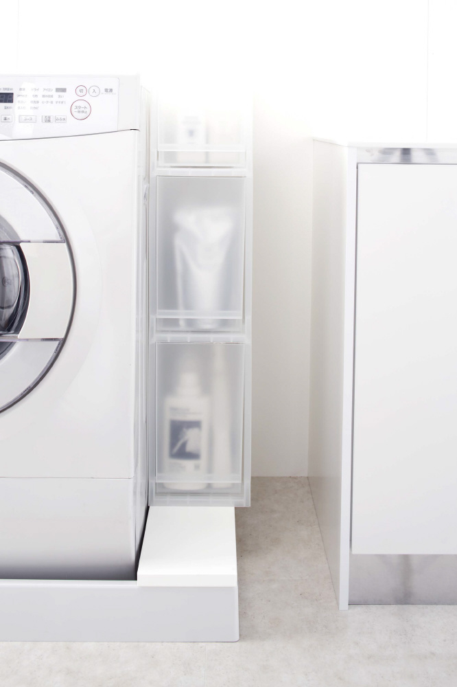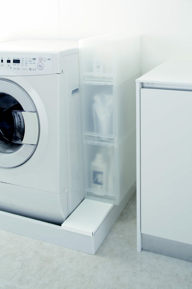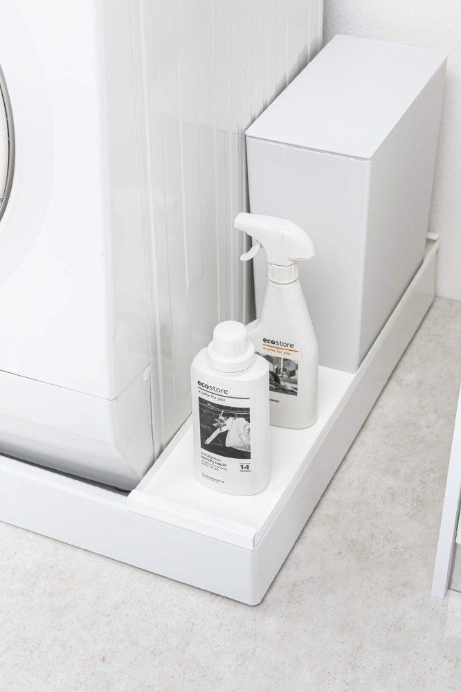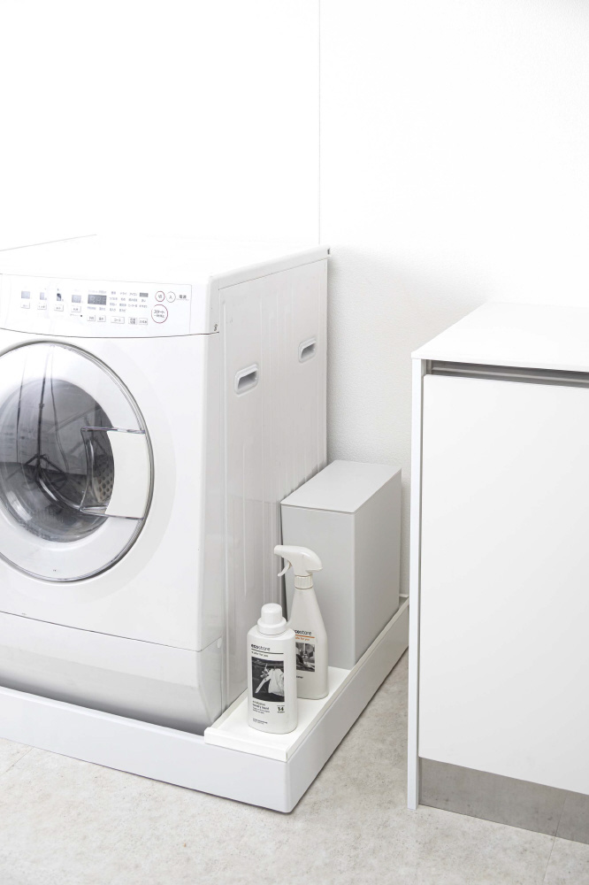 防水パンの上に置くだけでその上を有効活用できるラックです。洗濯機の排水口とホースを隠して埃もガード!表面と裏面の両面仕様だから収納するものや用途で変えられます!裏面で使用する場合はガードがあるから、洗剤ボトルやゴミ箱などの小物を置くのに適しています。表面で使用する場合はフラットなので、収納ラックなどの幅のある大きいものを置くのに便利です。