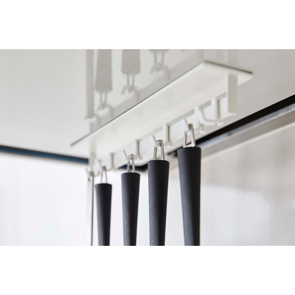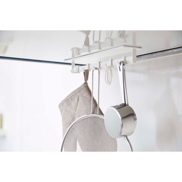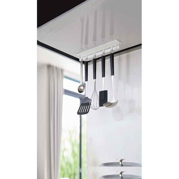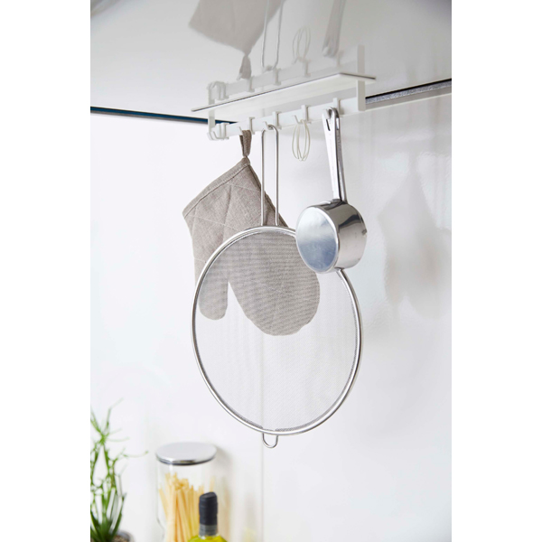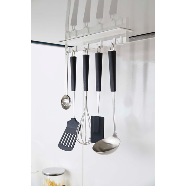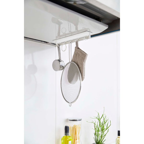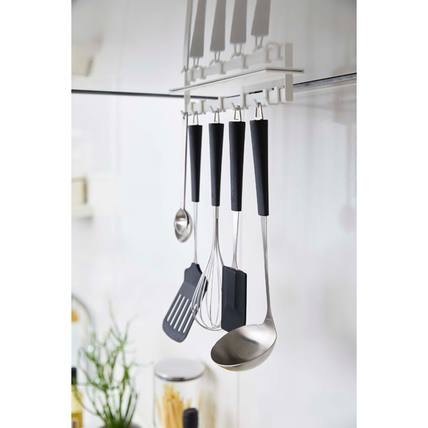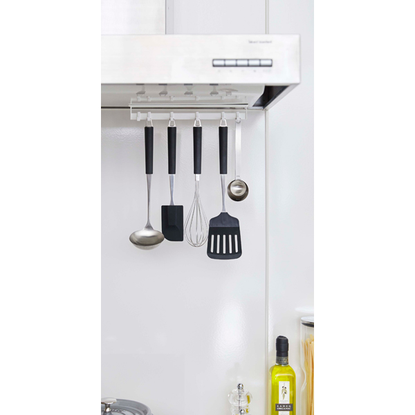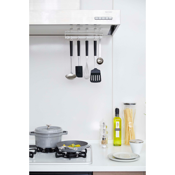 レンジフードのスチールカバー面に(整流板)マグネットで簡単取り付けのキッチンツールフック。調理道具・鍋つかみ・計量スプーンなど、よく使うキッチンツールを掛けておくのに便利!スチール棚板の裏面にも取り付け可能。レンジフードの整流板に磁石で簡単取り付け。