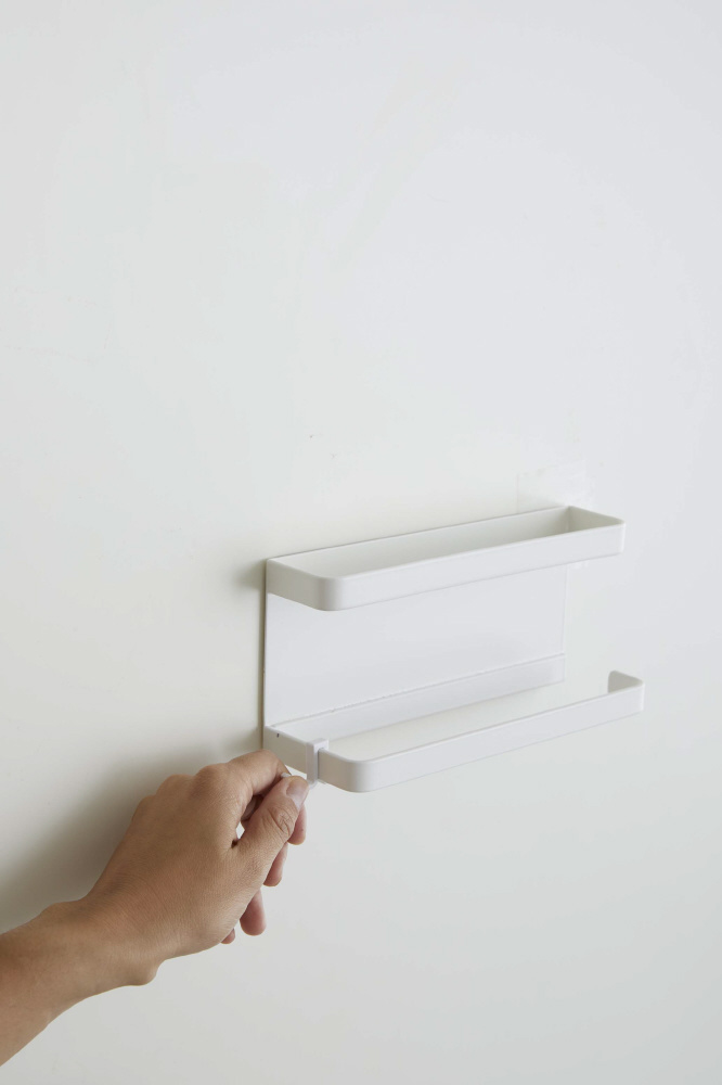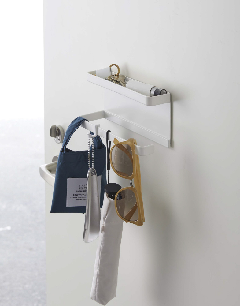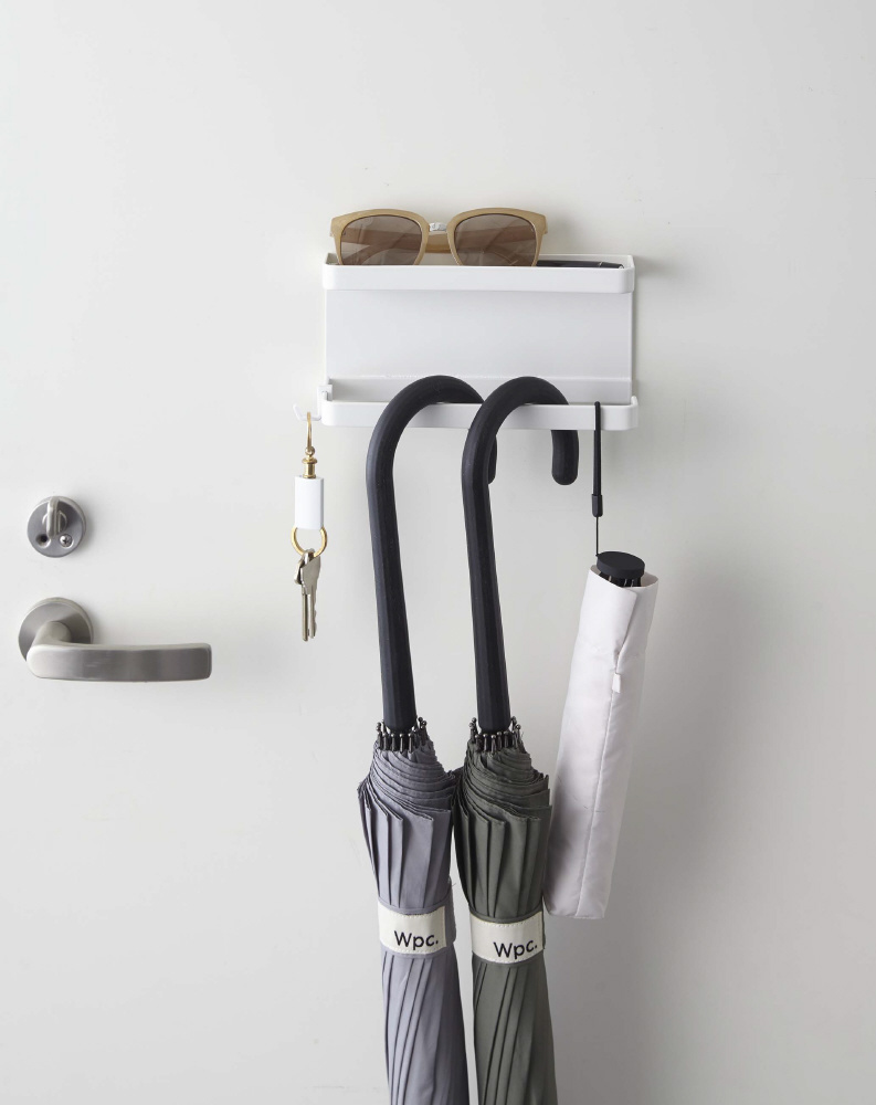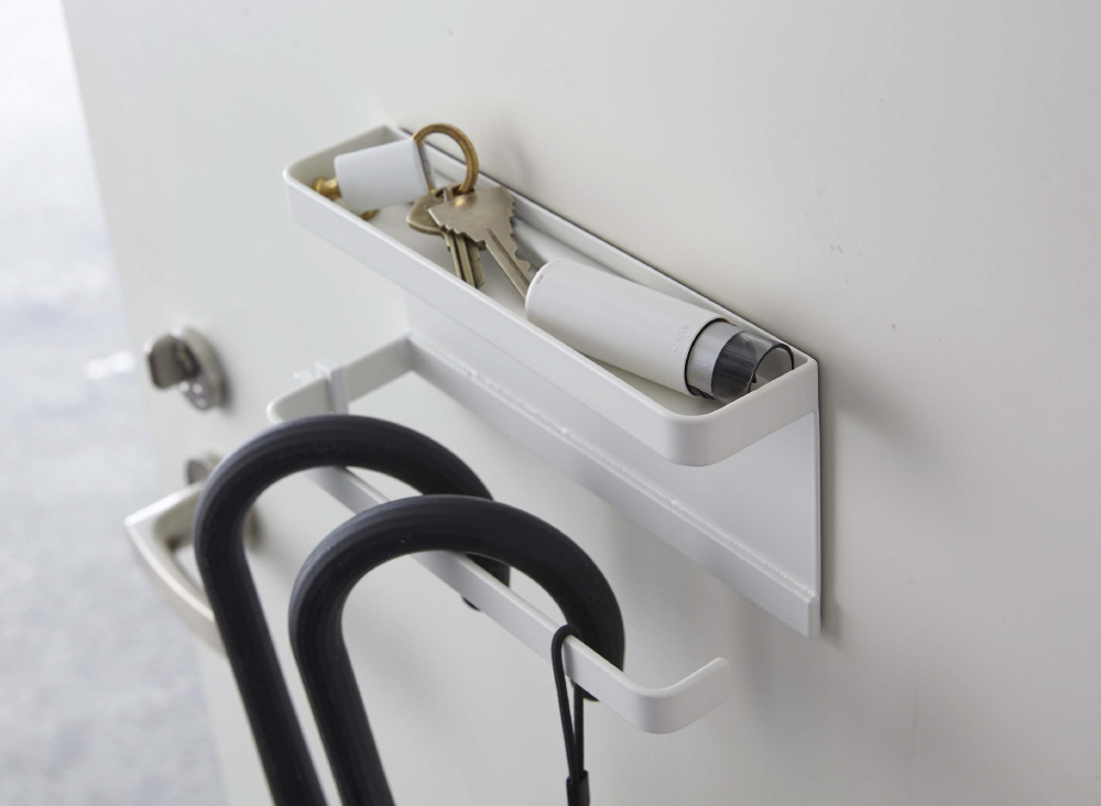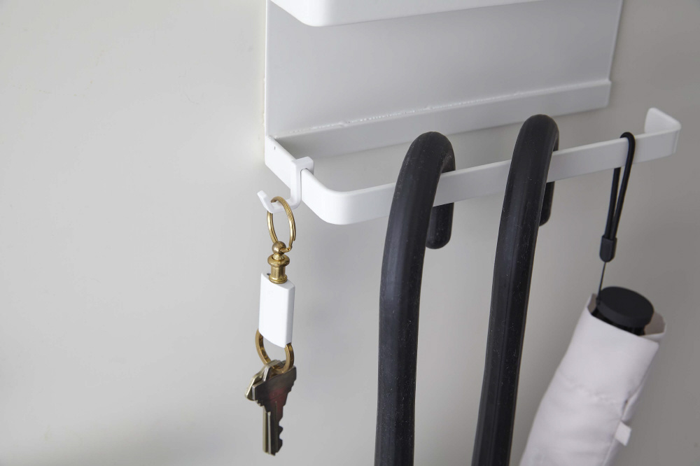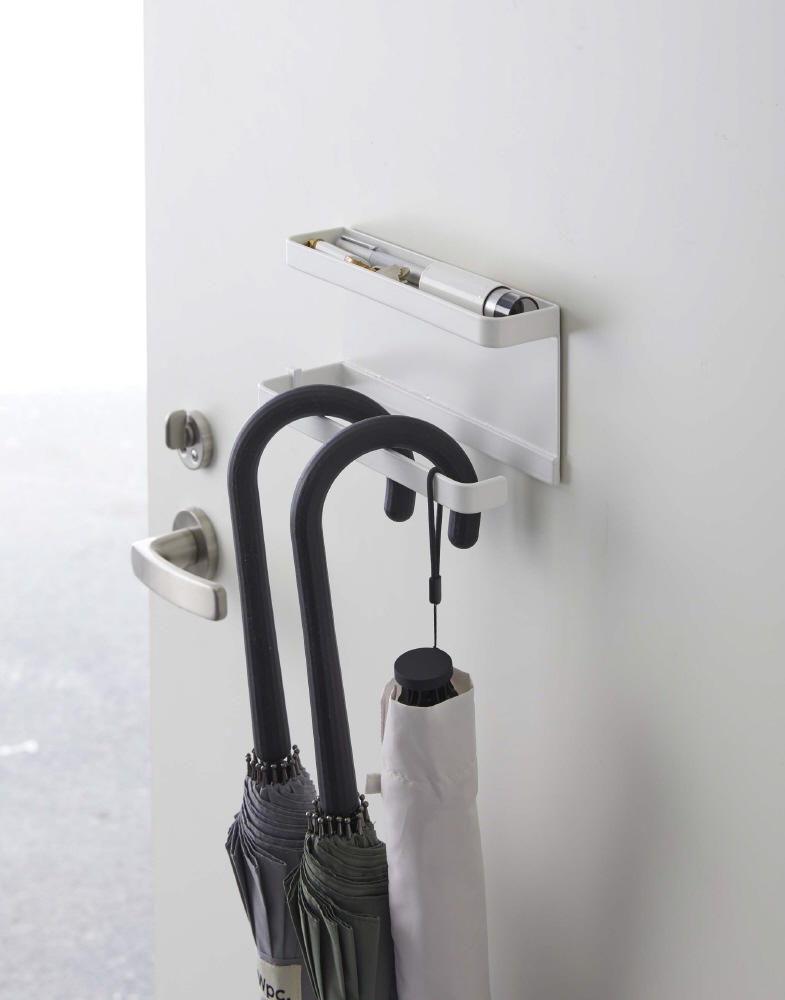 スチール製の玄関扉にマグネットで簡単取り付け。傘や折り畳み傘をかけて収納。荷受時の印鑑やサインがスムーズに。付属のフックを引っ掛けて収納もできる。玄関で散らかる小物をまとめるのにも便利。