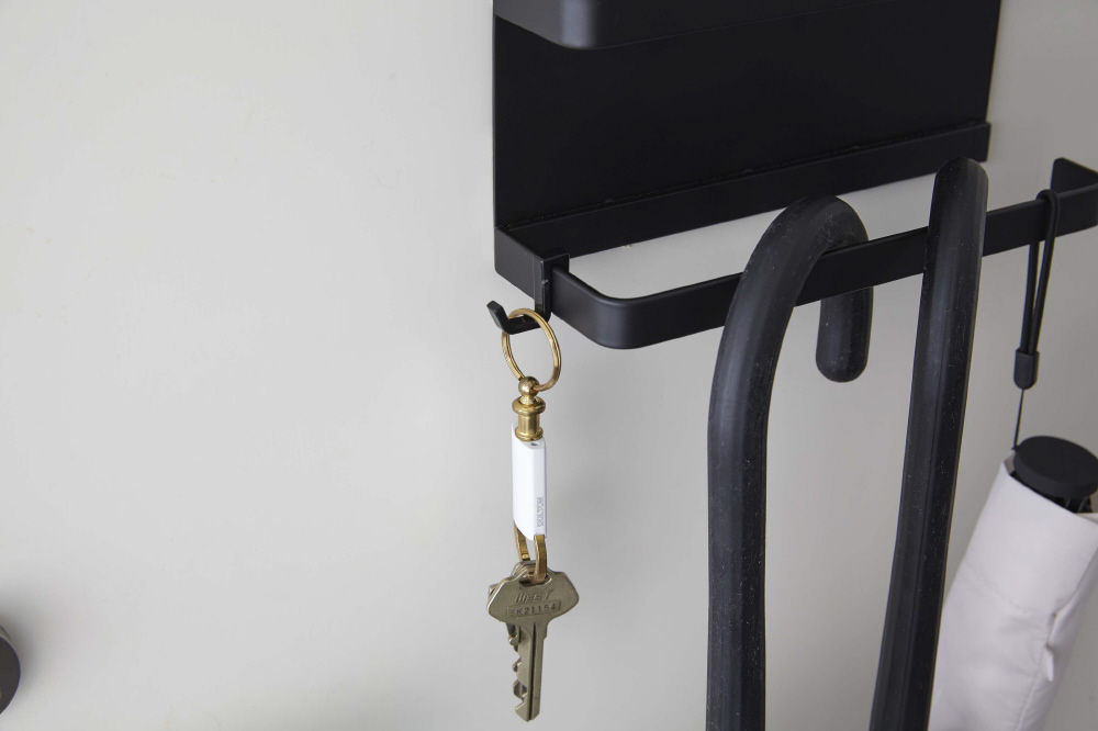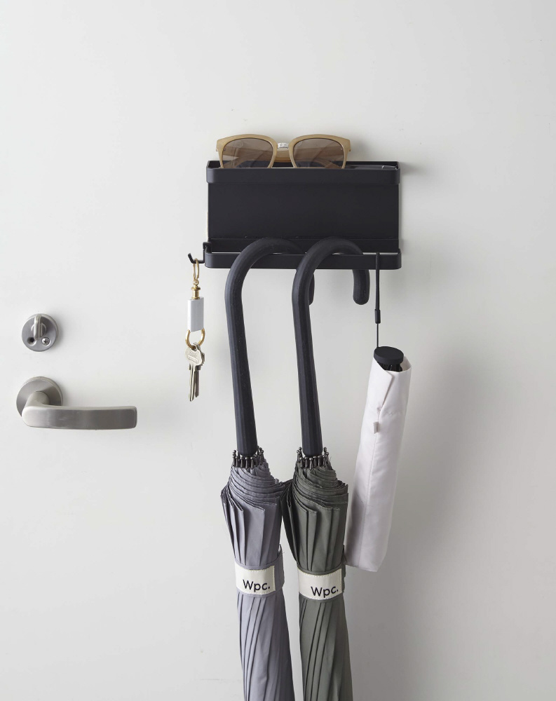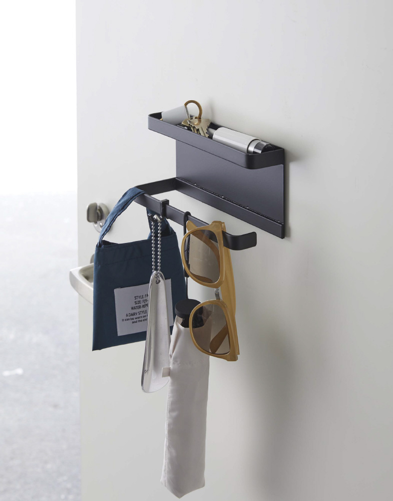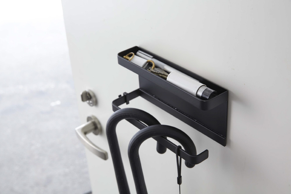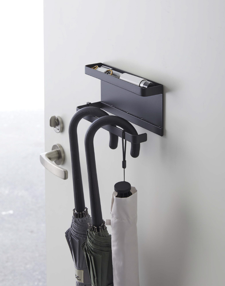 スチール製の玄関扉にマグネットで簡単取り付け。傘や折り畳み傘をかけて収納。荷受時の印鑑やサインがスムーズに。付属のフックを引っ掛けて収納もできる。玄関で散らかる小物をまとめるのにも便利。