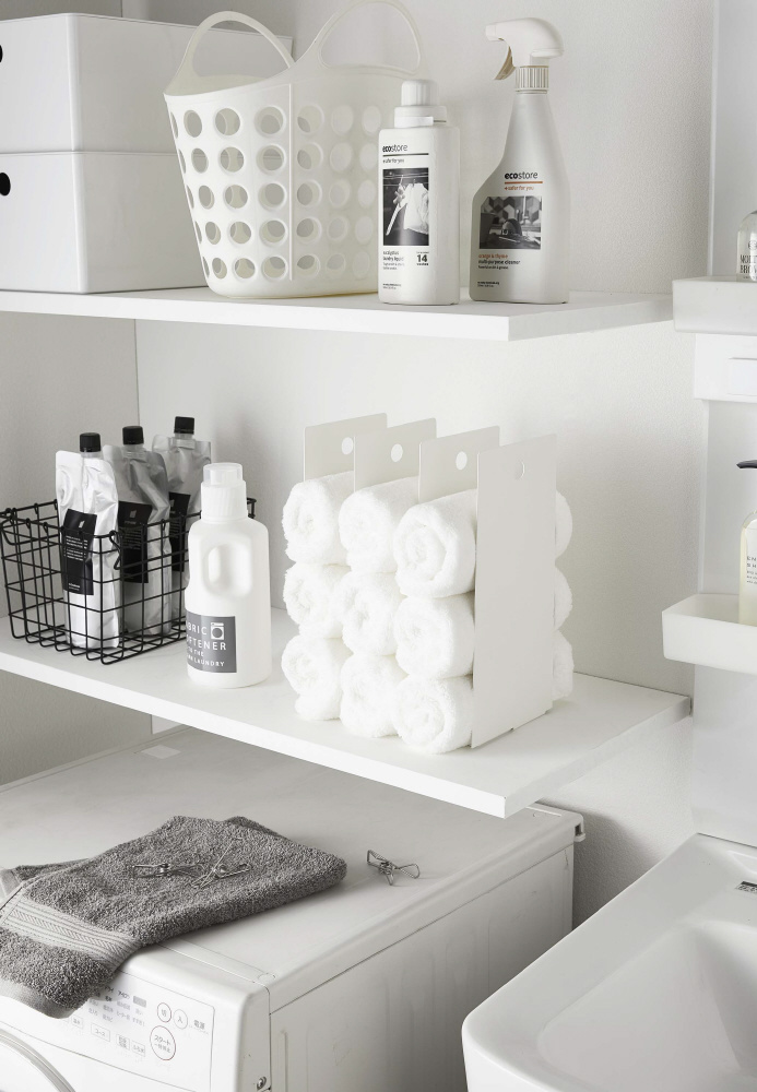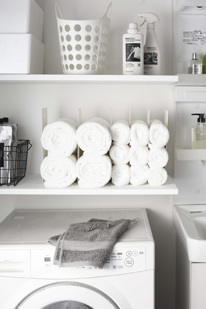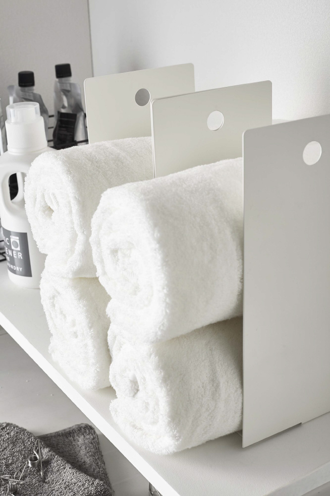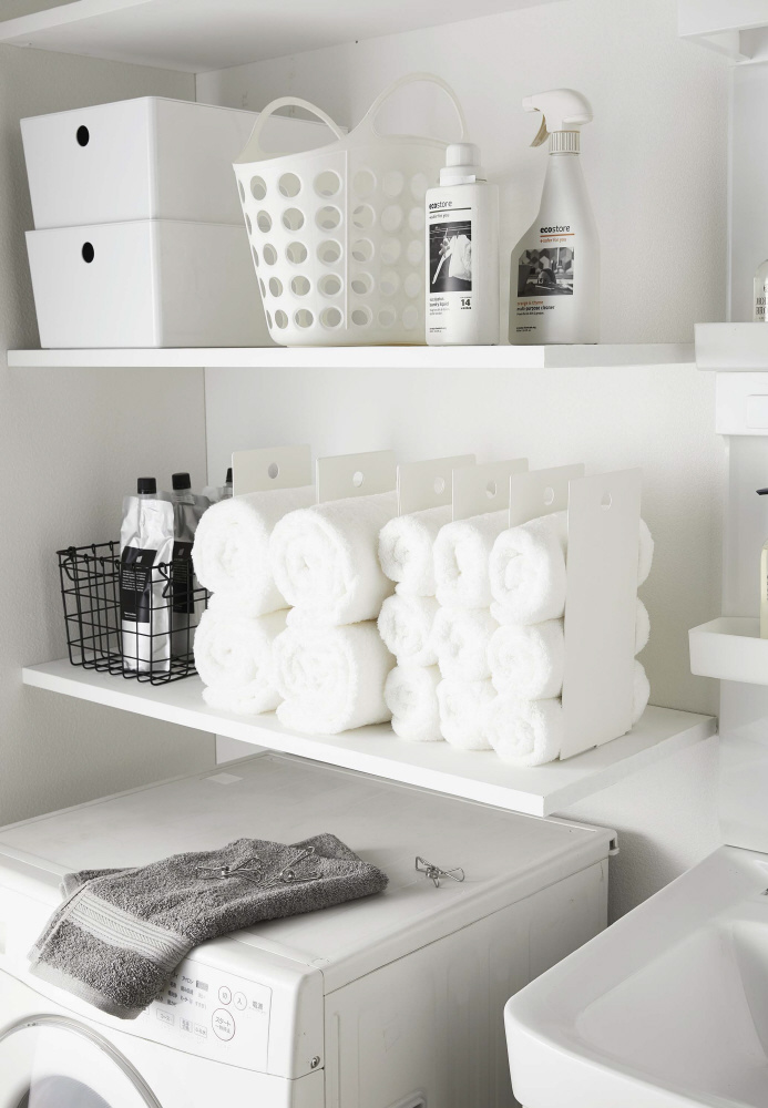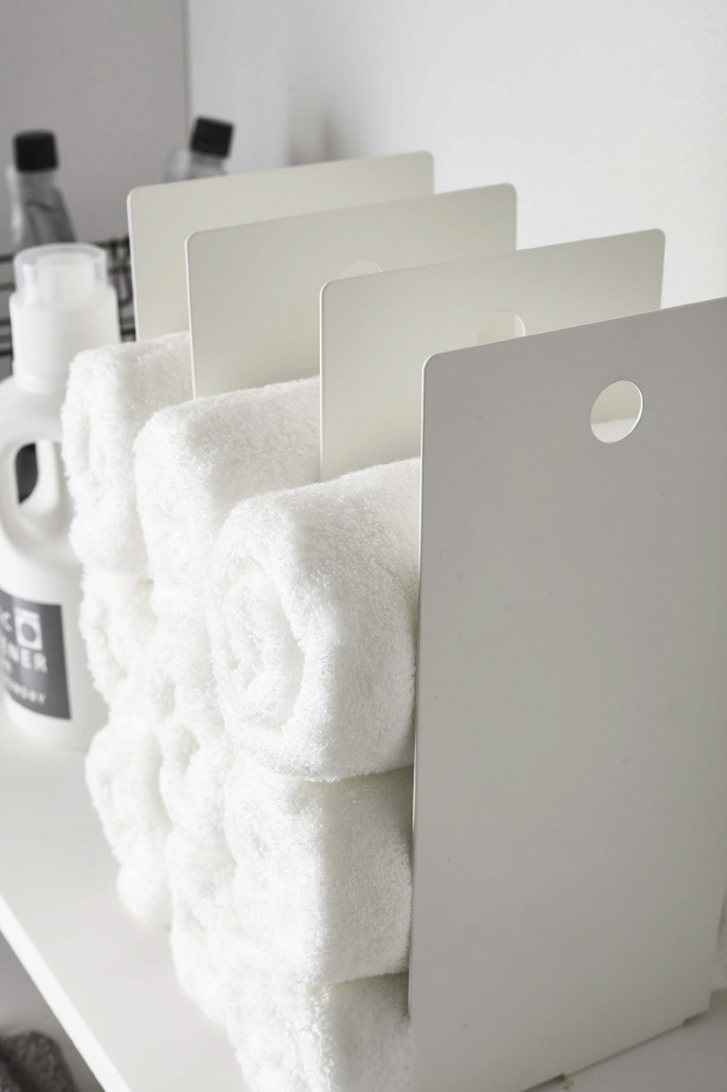 タオルのサイズに合わせて収納幅を調整!フェイスタオルからバスタオルまで収納可能!タオルをまとめてすっきりと収納できるから取り出しやすく便利。タオルの用途・種類・大きさによって見やすく分けられます。