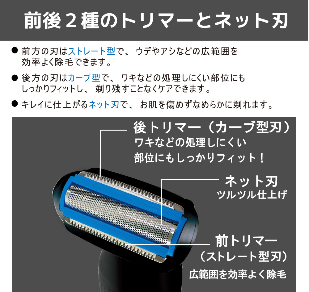 ※前方の刃はストレート型で、腕や胸、お腹などの広範囲を効率よく除毛できます。後方の刃はカーブ型で、ワキなどの処理しにくい部位にもしっかりフィットし、剃り残すことなくケアできます。