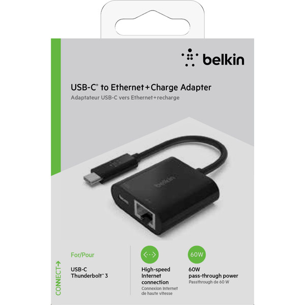 ノートパソコンやタブレットのUSB-Cポートに本製品のUSB-C端子(Thunderbolt 3ポート対応)を接続し、LANポートにて最高速度1Gbpsのインターネット接続ができ、同時にUSB-Cポートより最大60W給電が可能です。