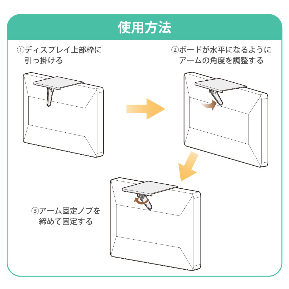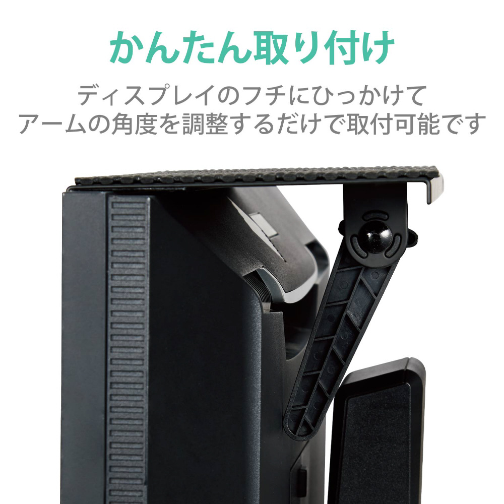 ■液晶ディスプレイのフチにひっかけてアームの角度を調整するだけの簡単取り付け。取り外しも簡単です。