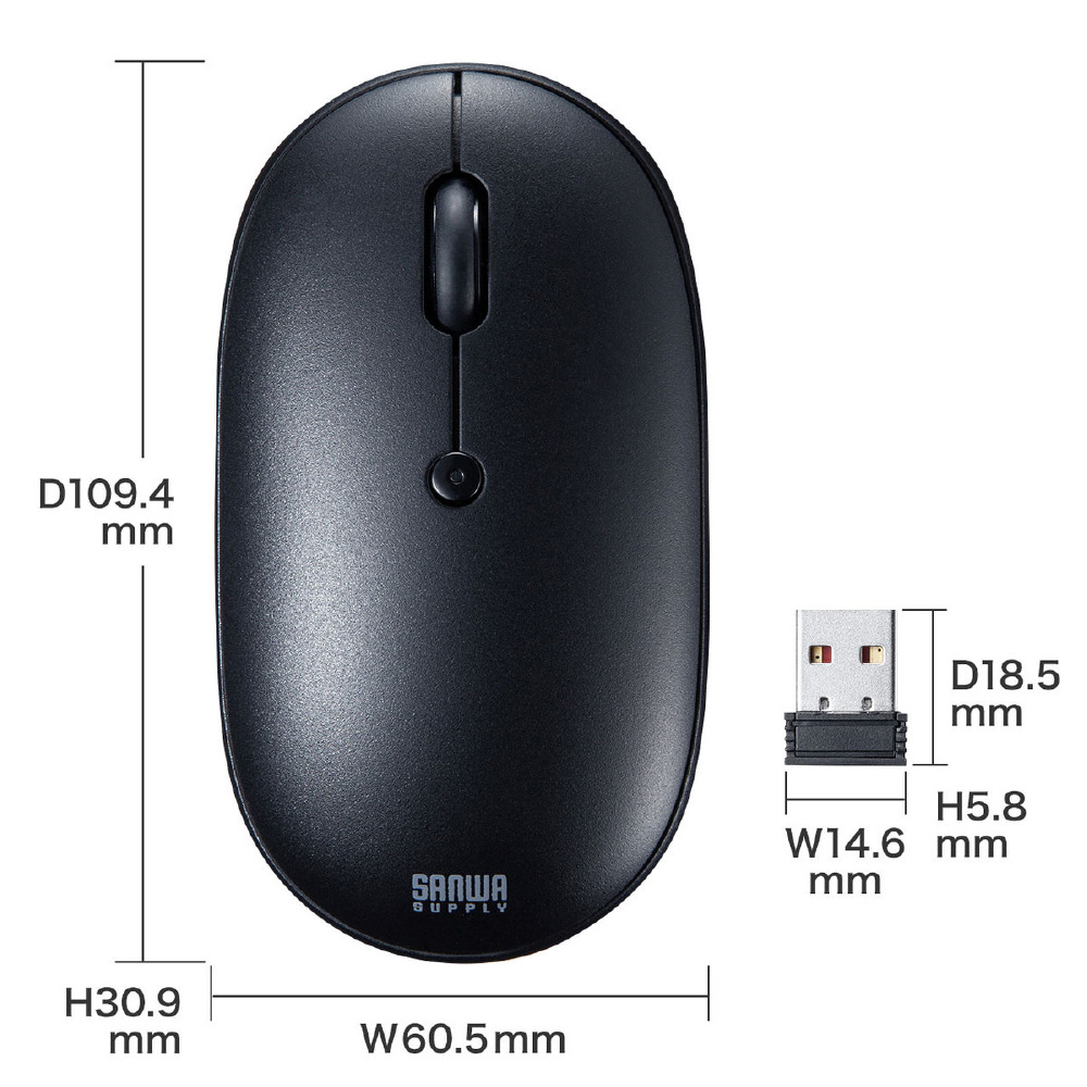 | 仕様3 | [バッテリー寿命] ・充電時間/3時間 ・連続動作時間/40時間 ・連続待機時間/400時間 ・使用可能日数/35日 ※一日8時間パソコンを使用中に、マウス操作5%程度行う場合。 【受信機】 インターフェース:USB コネクタ形状:USB Aコネクタオス サイズ:W14.6xD18.5xH5.85mm 重量:1.8g 通信範囲:最大約10m ※使用環境により異なります。 |