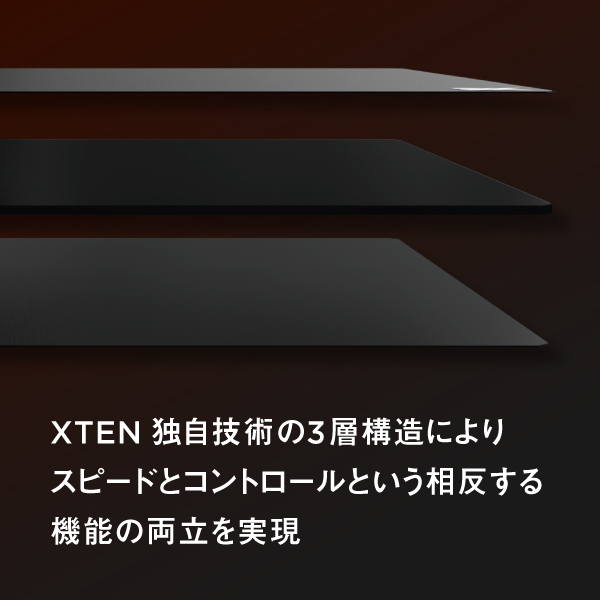 膨大な種類の材料をテストし、摩擦係数や感触までも数値化。単純な数字の大小の比較だけでなく、数字の振れ幅や細かな特性を徹底追及しました。XTEN ゲーミングマウスパッドシリーズの中で最も摩擦係数が少ない最速モデルです。