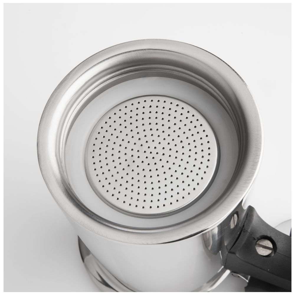 家庭で本格的なイタリアンコーヒーが味わえる。沸騰した水の蒸気圧でコーヒーを抽出する方式の直火式(IHにも対応)のエスプレッソコーヒーメーカー。使い方は簡単、市販のコーヒー挽豆をフィルターに充填し、下部のボイラー容器に水を入れて直火にかけると、あっという間に美味しいコーヒーができる。また、アルコールランプやアウトドアコンロ等でも抽出できるため、キャンプや登山など屋外で淹れることも可能である。