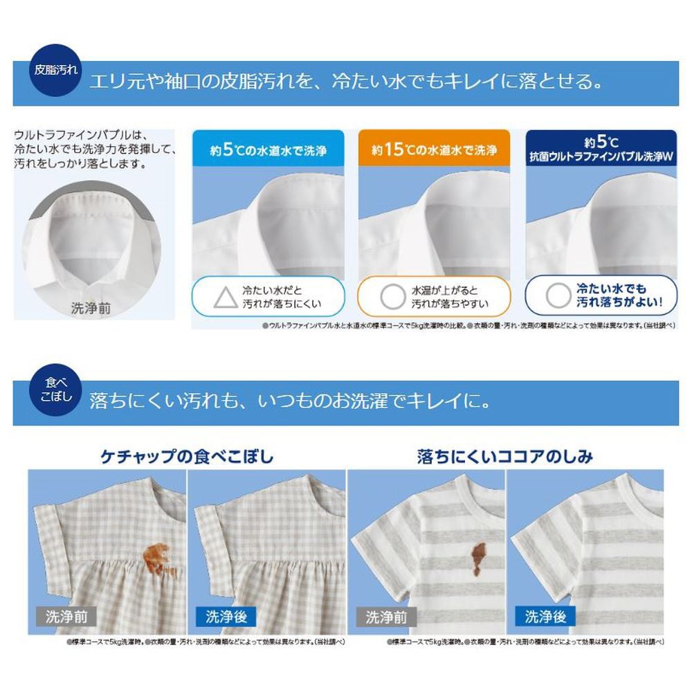 目には見えないナノサイズの泡が繊維の奥へ入り、洗剤のチカラを引き出し徹底洗浄!すすぎにもウルトラファインバブルを使用して、汚れも洗剤もスッキリ洗い流す!