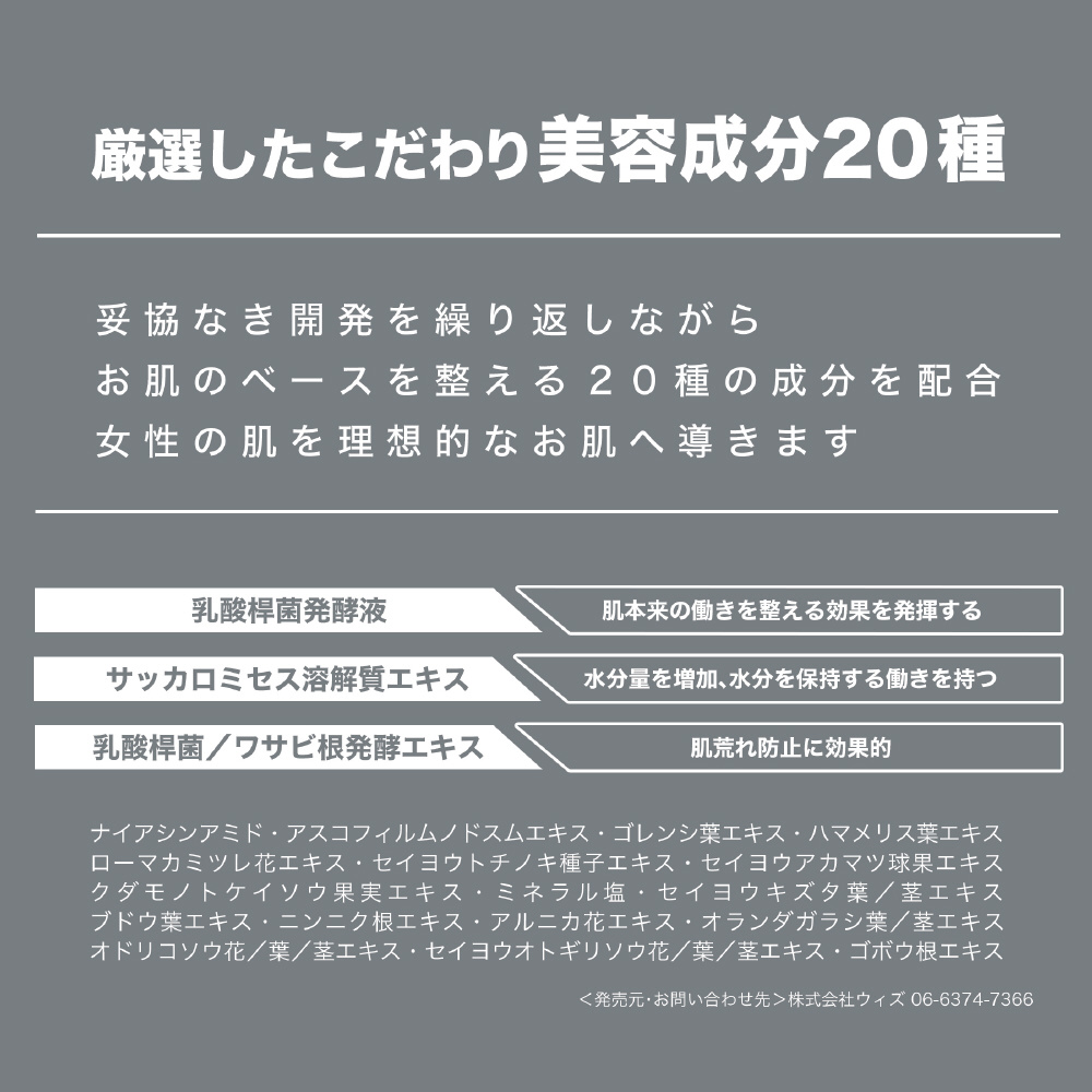 | 仕様1 | [全成分]水、BG、グリセリン、ナイアシンアミド、乳酸桿菌発酵液、乳酸桿菌/ワサビ根発酵エキス、サッカロミセス溶解質エキス、アスコフィルムノドスムエキス、ゴレンシ葉エキス、クダモノトケイソウ果実エキス、アルニカ花エキス、セイヨウキズタ葉/茎エキス、セイヨウトチノキ種子エキス、ハマメリス葉エキス、ブドウ葉エキス |