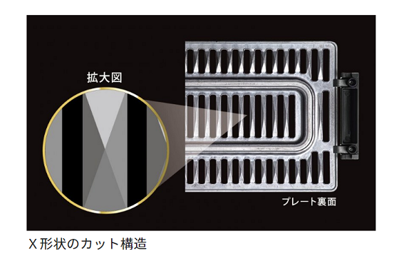 A上面曲線形状:プレートの表面(焼き面)を平面ではなく、曲線形状にすることで、油が下に流れやすくなります。焼き面から下に流れた油は、X形状により、プレートから滴り落ちていきます。