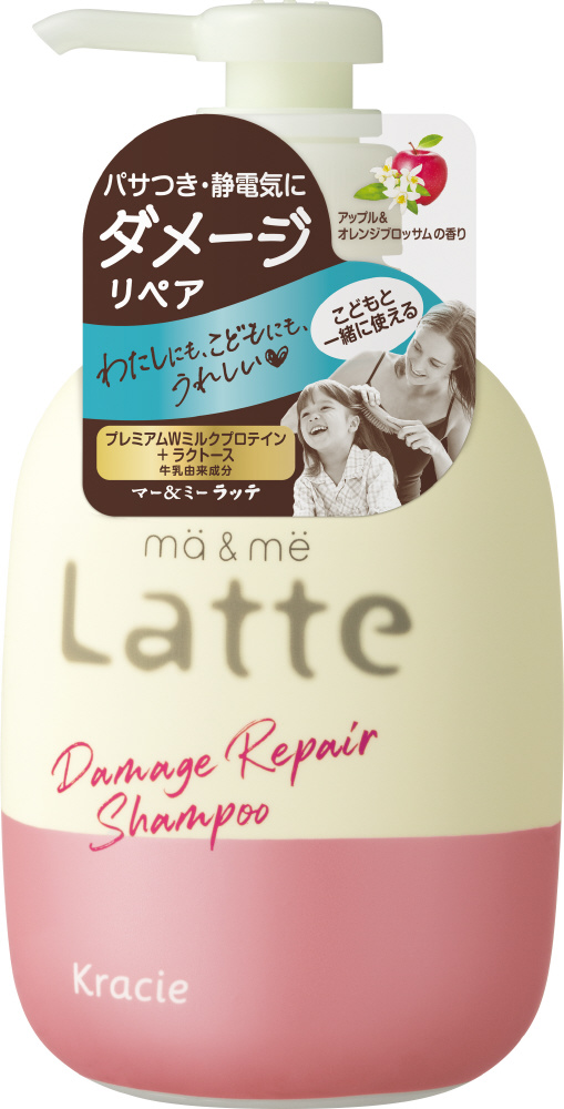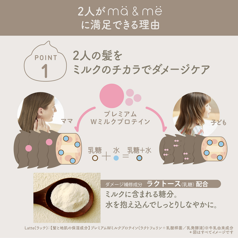 髪と地肌の保湿成分プレミアムWミルクプロテイン、ダメージ補修成分ラクトース配合。