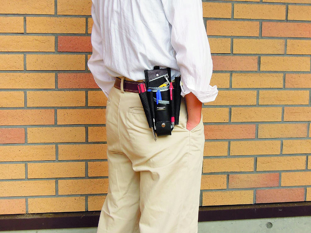 ドライバー、カッター、ニッパーなどの工具収納に。着脱簡単!背面クリップ付き。2way装着対応:クリップ・カラビナで装着できる。反射ライン付き。撥水加工ポリエステル使用。