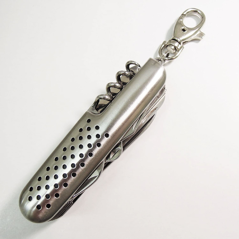 本体収納サイズ;約W28xH95xD20mm (キーホルダーは含まない)。材質;本体/ステンレススチール鋼、ナイフ/440Aステンレス鋼、キーホルダー/亜鉛ダイキャスト(ニッケルメッキ)。