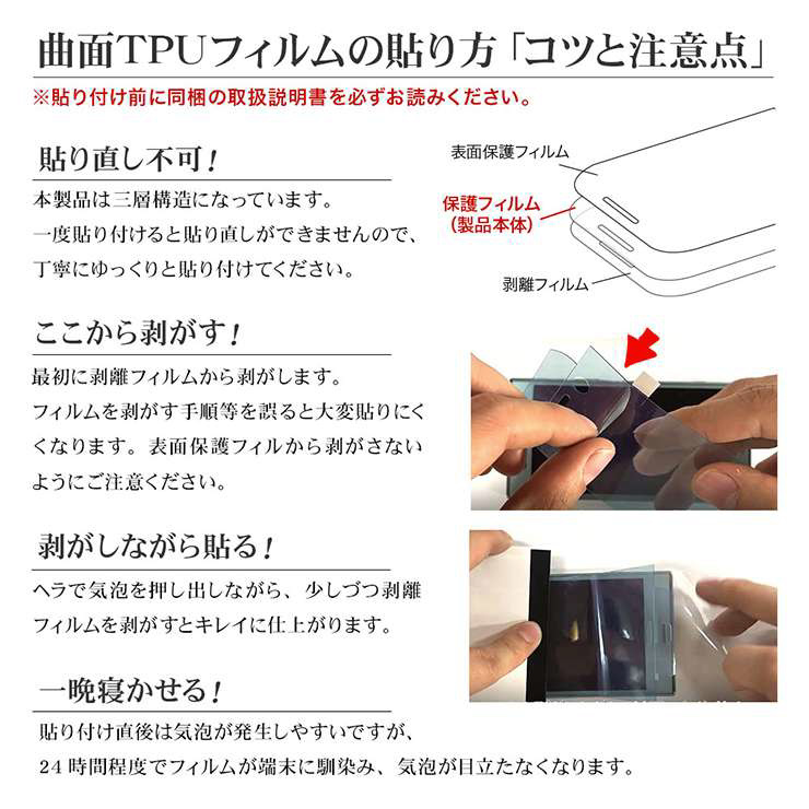 | 仕様3 | しなやかに馴染むTPU素材で湾曲部分にもぴったりと貼りつきます。 |