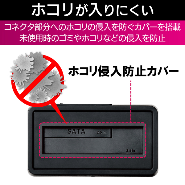 本製品はHDD/SSDを挿すだけで簡単に組立できるシンプルで使いやすいHDD/SSDスタンドです。 2.5/3.5インチどちらのドライブも使用することが出来ます。 またホコリ侵入防止カバーを搭載しておりますので、接触不良の原因になるホコリの侵入を防ぎます。 さらにUSB3.2Gen2に対応しておりますので、SSDの性能を最大限発揮することが出来ます。