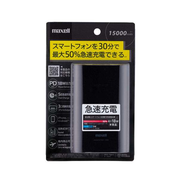 PD18W対応モバイルバッテリー 3口出力 [USB Power Delivery対応] ブラック MPC-CPD15000PBK [15000mAh /USB Power Delivery・Quick Charge対応 /3ポート /充電タイプ]