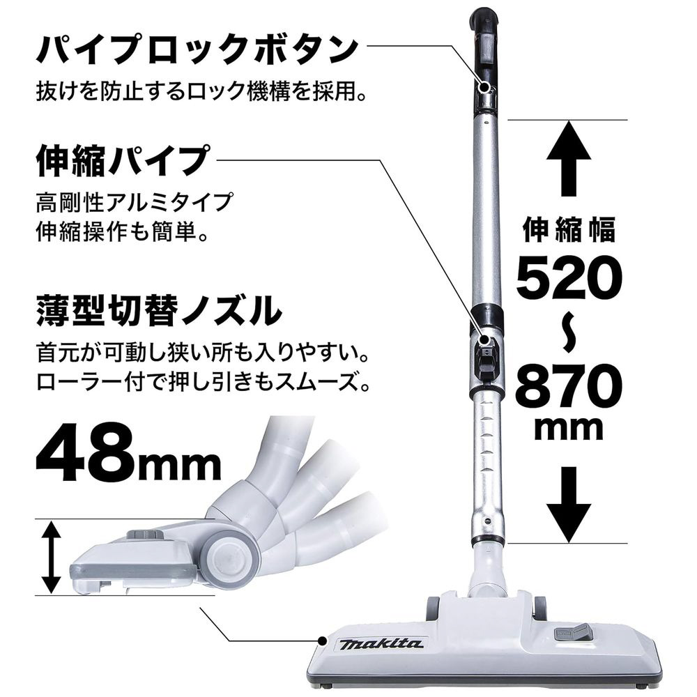 | 充電使用時間 | 吸込力[5]:約40分/吸込力[1]:約1時間40分(BL1860B(A-60464)×2本使用時) |
