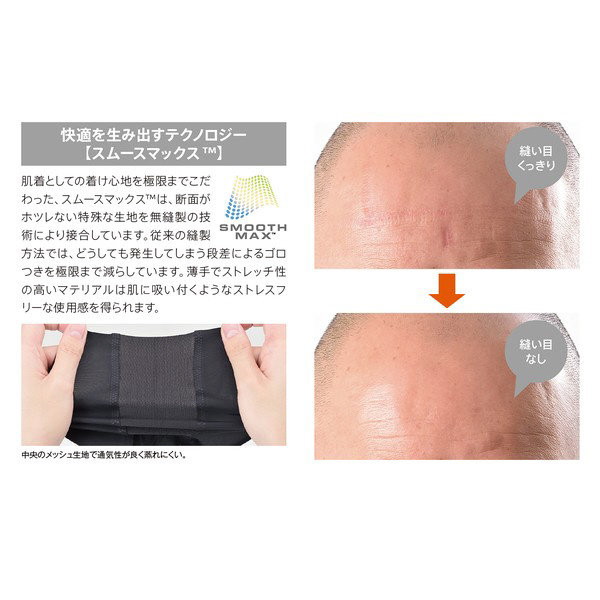 肌着としての着け心地を極限までこだわった、スムースマックスは、断面がホツレない特殊な生地を無縫製の技術により接合しています。