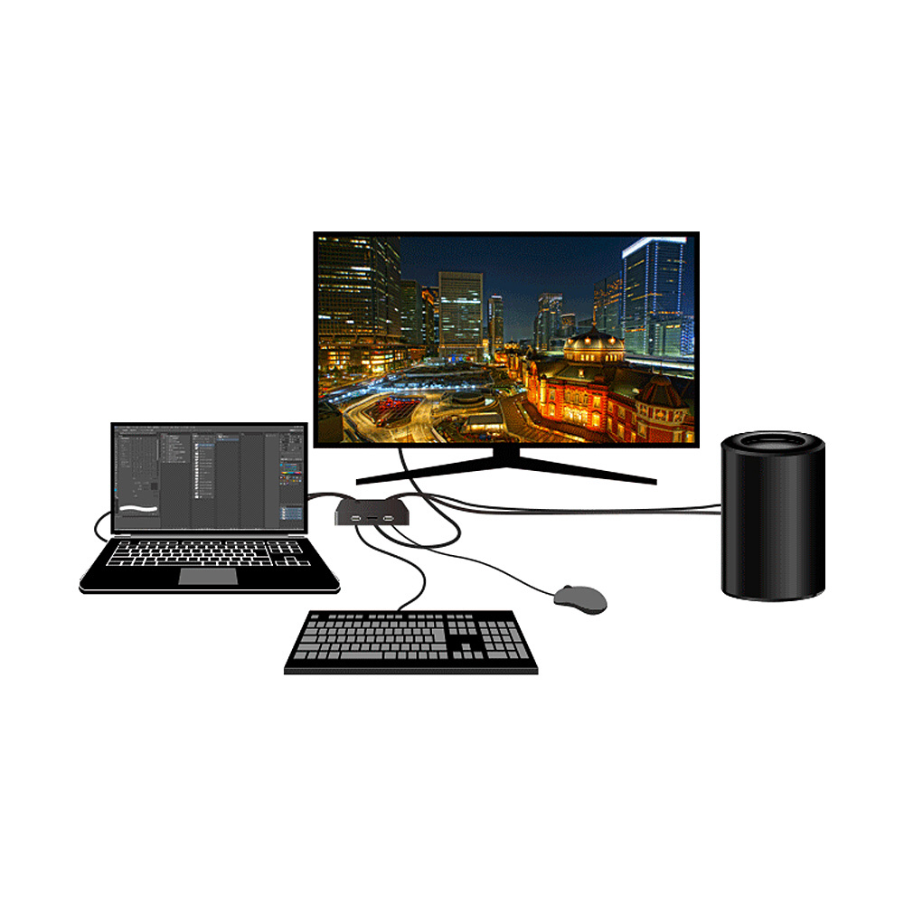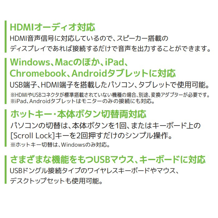4K HDMIディスプレイ、USBキーボード・マウス対応のパソコン切替器!Windows、macの他に、iPad、Chromebook、Androidタブレットにも対応!ウルトラワイドモニターUWQHD (3440×1440)、UWFHD (2560×1080)での動作も確認済みです。