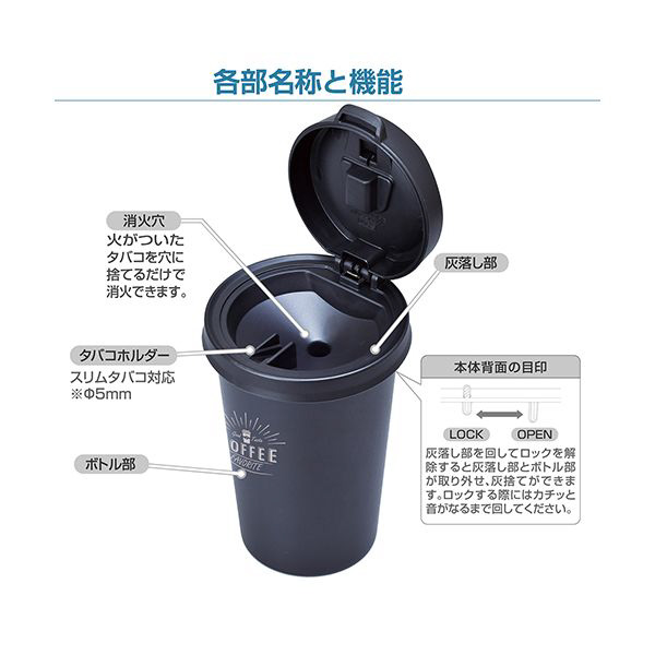 ●ドリンクホルダーに入れてあっても違和感のない、カフェカップ型のかわいい灰皿です。