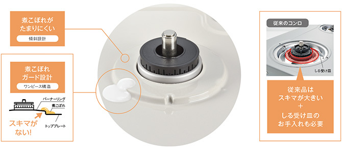 お手入れ簡単!ワンピーストップバーナーリングとクリスタルコートトッププレートで、快適な調理を実現。