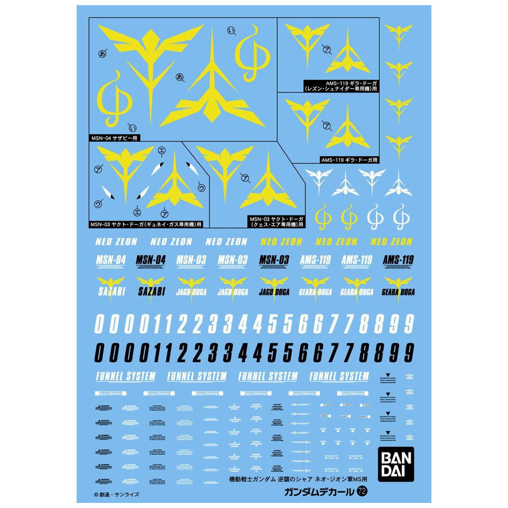 | 商品名 | ガンダムデカール No.72 HG 1/144 機動戦士ガンダム 逆襲のシャア ネオ・ジオン軍MS用 |