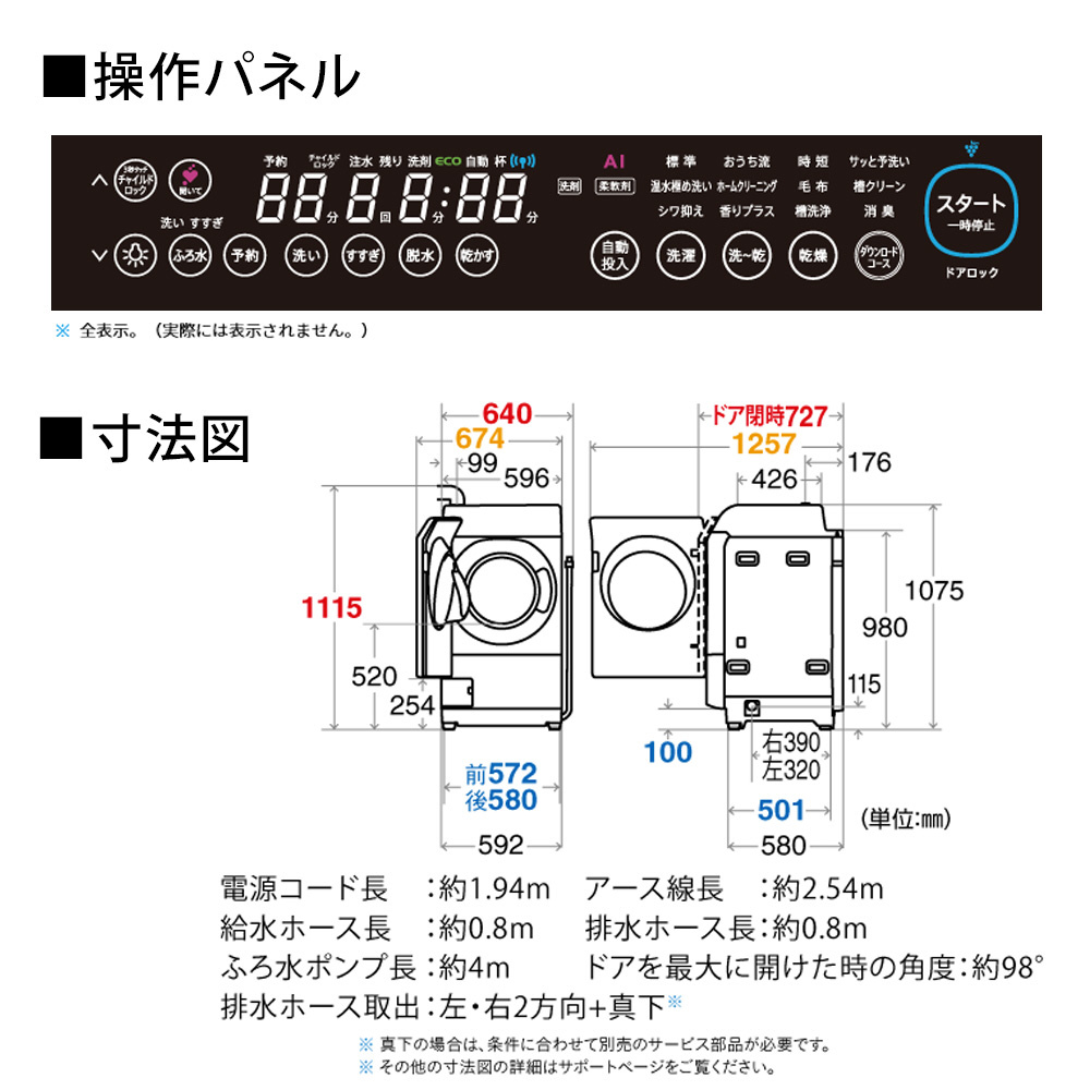 | 付属品 | 給水ホース、ふろ水ポンプ、外部ホース、水準器、輸送用固定ねじ(上用×2・下用×2)、輸送用固定ねじ取りはずしスパナ、ビスシート(2枚入×2)、取扱説明書、保証書、据付チラシ、洗剤ご使用ガイド、シャープクラウドサービスガイド |