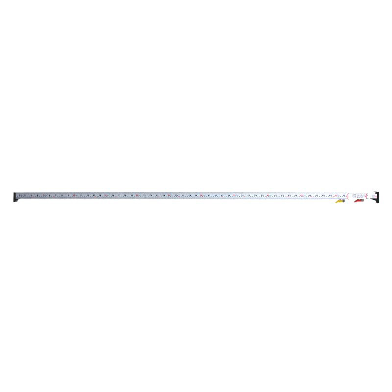 本体の裏面に、書いて消せる「テープ付」材質:突き当て部/ABS樹脂、竿/アルミ、ストッパーレバー/ポリカーボネート樹脂、ジョイント/ポリアセタール樹脂、外測用フック/ステンレス 長さの許容差:2メートルまで±1.0ミリ、2メートル以上±0.5ミリ/メートル測定範囲:1704ミリ(5尺6寸2分相当)〜4699ミリ(15尺5寸1分相当)