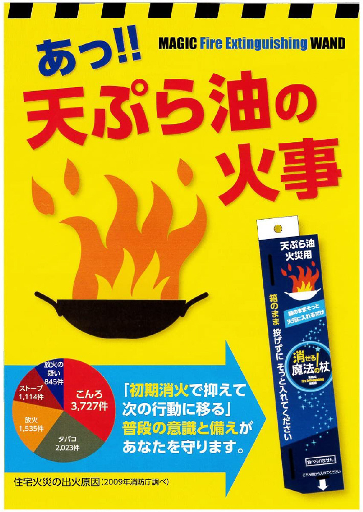 天ぷら油火災用初期消火剤。箱のままそっと入れるだけ。1L以下の天ぷら油火災に対応。