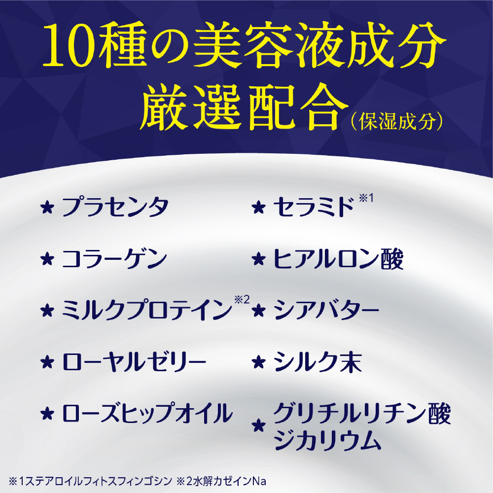 ・プラセンタ、セラミド、コラーゲン、ヒアルロン酸、ミルクプロテイン、シアバター、ローヤルゼリー、シルク末、ローズヒップオイル、グリチルリチン酸ジカリウム