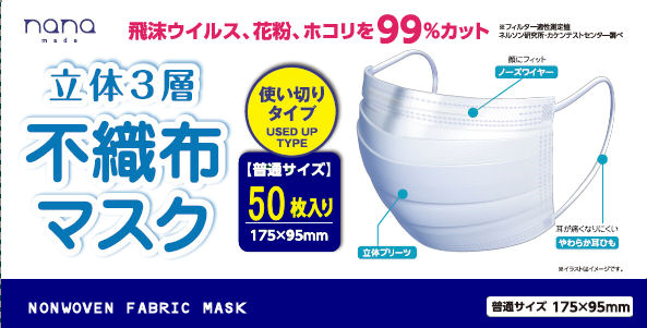 | 商品名 | 立体3層不織布マスク ふつうサイズ 50枚入 |